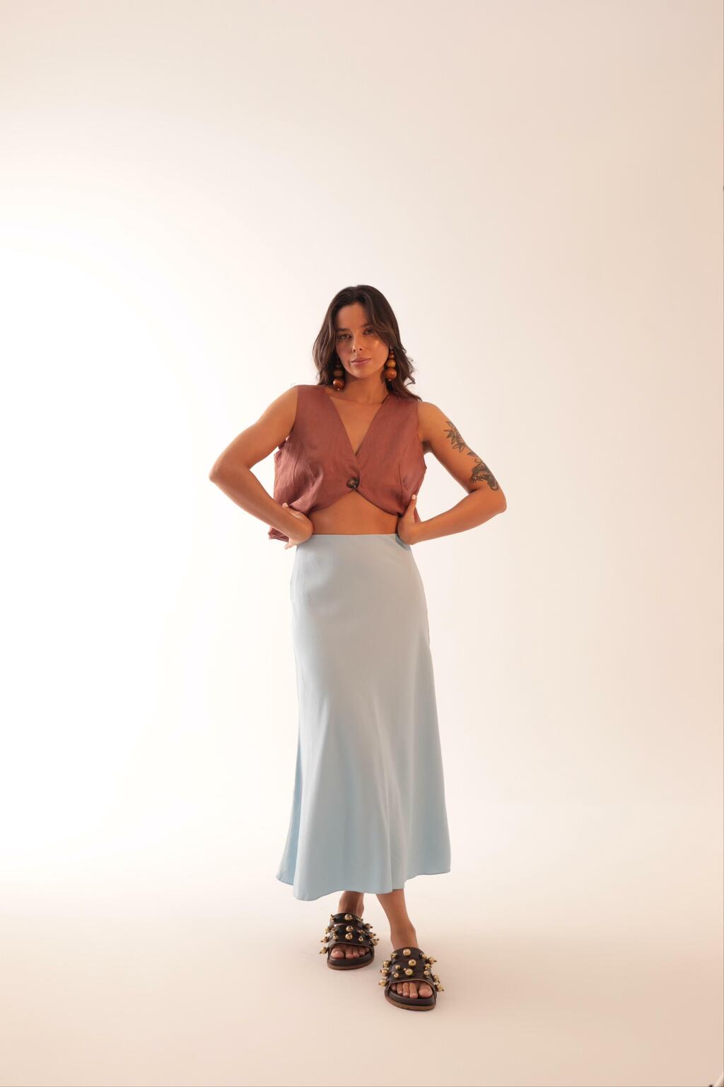 look composto pelo colete caraíva em linho e saia retrô azul celeste.