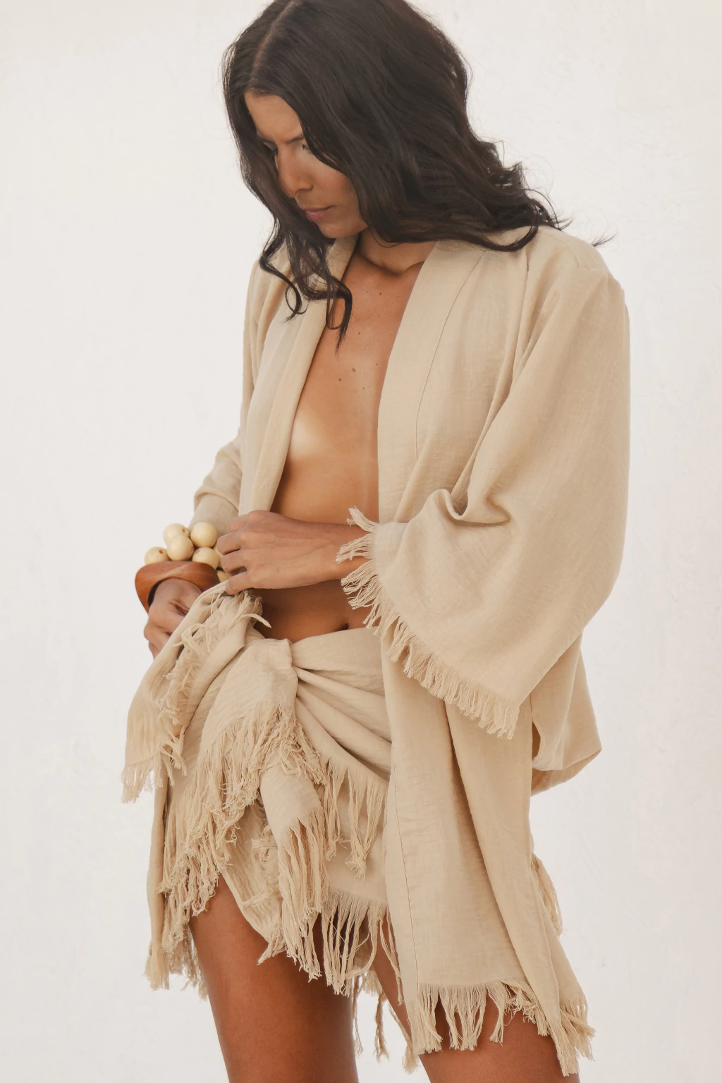 kimono com modelagem bem ampla e mangas longas! detalhes das barras e mangas desfiadas! tam. único