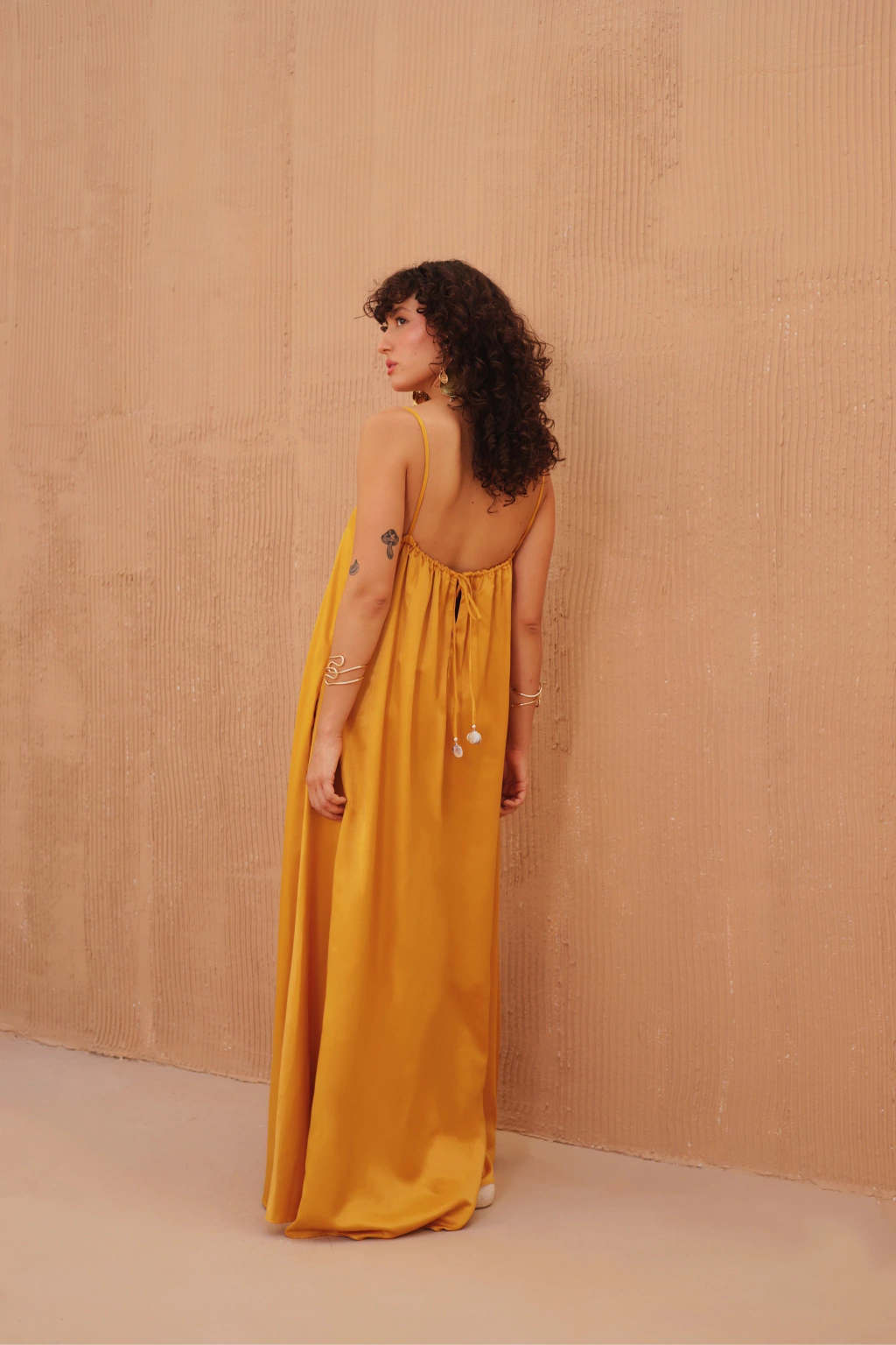vestido longo com decote reto, alças super finas e amarração nas costas.