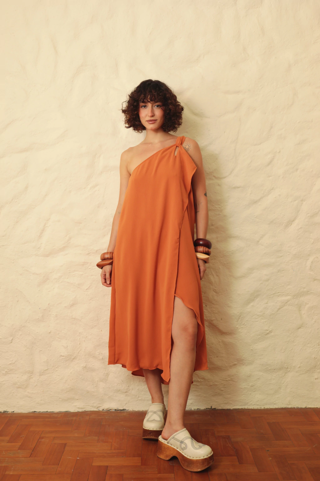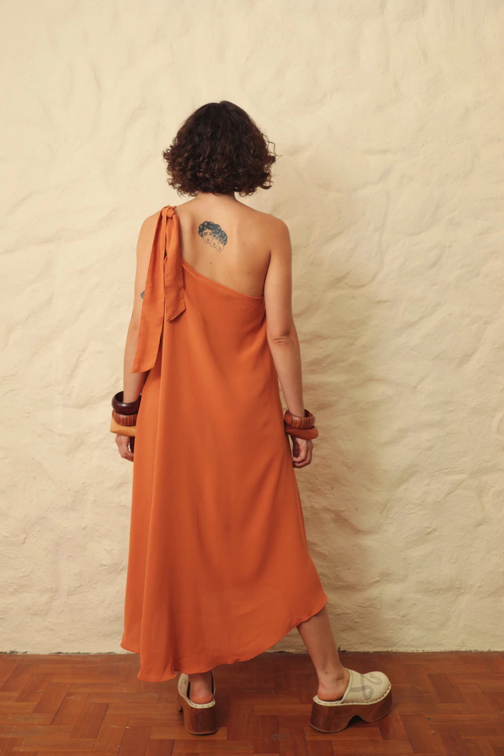 vestido midi com modelagem ampla e caimento leve.